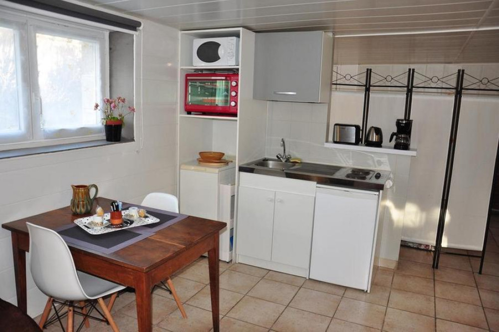- un salon avec un canape non convertible une TV, un lecteur DVD et le wifi, un coin repas, une cuisinette ouverte (réfrigérateur, lave linge, 2 plaques électriques)