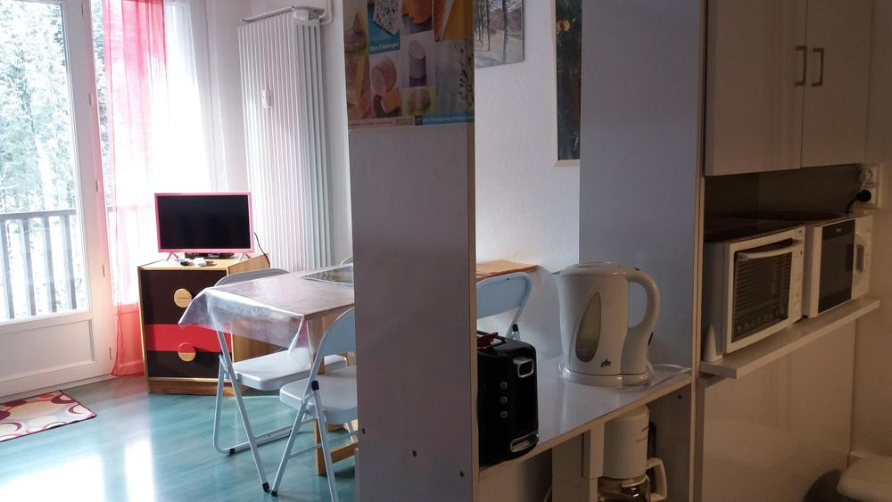 Studio de plein pied avec balcon au 1er étage, à Font d'Alagnon, exposé sud face à la montagne. Au pied des pistes et des chemins de randonnéesPas de vis à vis. Porte de séparation entre le coin montagne et la pièce principale.